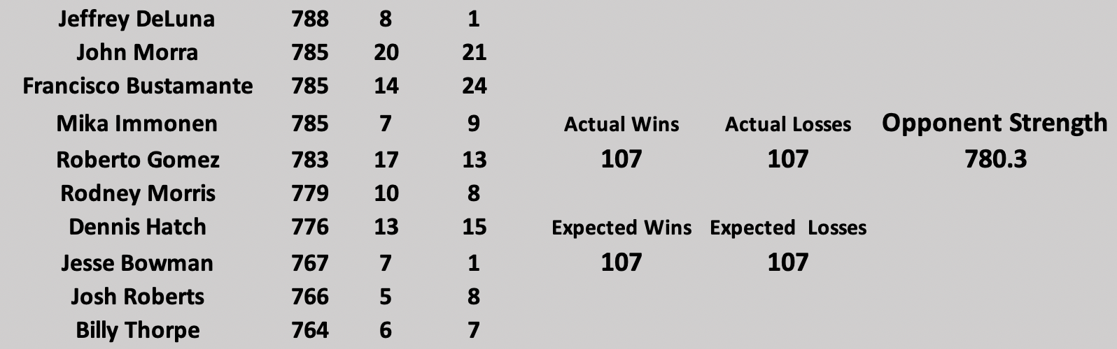 It is interesting to check out the group of opponents who average about 100 points below Corey because this crowd is expected to win about one in three games. Here is the group of opponents rated between 658 and 706 with an effective average of 680.1.